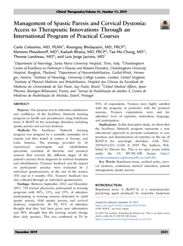 Title: | Management of Spastic Paresis and Cervical Dystonia: access to Therapeutic Innovations Through an International Program of Practical Courses |