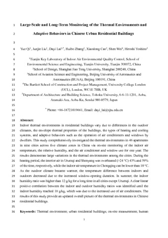 Title: | Large-scale and long-term monitoring of the thermal environments and adaptive behaviors in Chinese urban residential buildings |