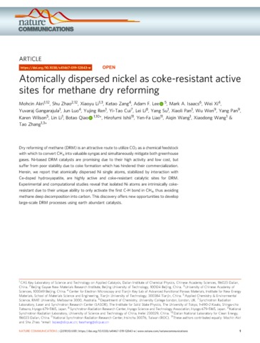 | Title: | Atomically dispersed nickel as coke-resistant active sites for methane dry reforming |