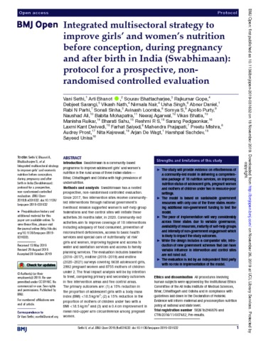 Title: | Integrated multisectoral strategy to improve girls' and women's nutrition before conception, during pregnancy and after birth in India (Swabhimaan): protocol for a prospective, non-randomised controlled evaluation |