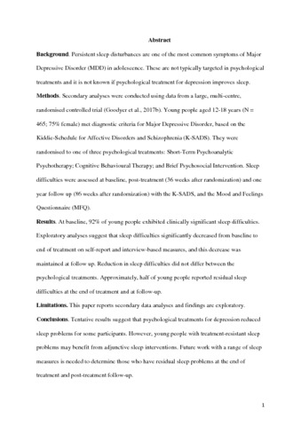 BACKGROUND: Persistent sleep disturbances are one of the most common symptoms of Major Depressive Disorder (MDD) in adolescence. These are not typically targeted in psychological treatments and it is not known if psychological treatment for depression improves sleep. METHODS: Secondary analyses were conducted using data from a large, multi-centre, randomised controlled trial (Goodyer et al., 2017b). Young people aged 12–18 years (N = 465; 75% female) met diagnostic criteria for Major Depressive Disorder, based on the Kiddie-Schedule for Affective Disorders and Schizophrenia (K-SADS). They were randomised to one of three psychological treatments. Sleep difficulties were assessed at baseline, post-treatment (36 weeks) and one year follow up (86 weeks) with the K-SADS, and the Mood and Feelings Questionnaire (MFQ). RESULTS: At baseline, 92% of young people exhibited clinically significant sleep difficulties. Exploratory analyses suggest that sleep difficulties significantly decreased from baseline to end of treatment on self-report and interview-based measures, and this decrease was maintained at follow up. Reduction in sleep difficulties did not differ between the psychological treatments. Approximately, half of young people reported residual sleep difficulties at the end of treatment and at follow-up. Limitations: This paper reports secondary data analyses and findings are exploratory. CONCLUSIONS: Tentative results suggest that psychological treatments for depression reduced sleep problems for some participants. However, young people with treatment-resistant sleep problems may benefit from adjunctive sleep interventions. Future work with a range of sleep measures is needed to determine those who have residual sleep problems at the end of treatment and post-treatment follow-up.
