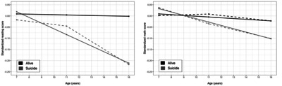 BACKGROUND: Poor cognitive abilities and low intellectual quotient (IQ) are associated with an increased risk of suicide attempts and suicide mortality. However, knowledge of how this association develops across the life-course is limited. Our study aims to establish whether individuals who died by suicide by mid-adulthood are distinguishable by their child-to-adolescence cognitive trajectories. METHODS: Participants were from the 1958 British Birth Cohort and were assessed for academic performance at ages 7, 11, and 16 and intelligence at 11 years. Suicides occurring by September 2012 were identified from linked national death certificates. We compared mean mathematics and reading abilities and rate of change across 7-16 years for individuals who died by suicide v. those still alive, with and without adjustment for potential early-life confounding factors. Analyses were based on 14 505 participants. RESULTS: Fifty-five participants (48 males) had died by suicide by age 54 years. While males who died by suicide did not differ from participants still alive in reading scores at age 7 [effect size (g) = -0.04, p = 0.759], their reading scores had a less steep improvement up to age 16 compared to other participants. Adjustments for early-life confounding factors explained these differences. A similar pattern was observed for mathematics scores. There was no difference between individuals who died by suicide v. participants still alive on intelligence at 11 years. CONCLUSIONS: While no differences in tests of academic performance and IQ were observed, individuals who died by suicide had a less steep improvement in reading abilities over time compared to same-age peers.