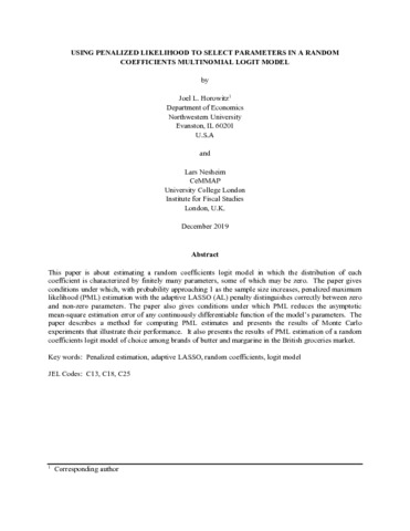 Keywords: | Penalized estimation, Adaptive LASSO, Random coefficients, Logit model |
