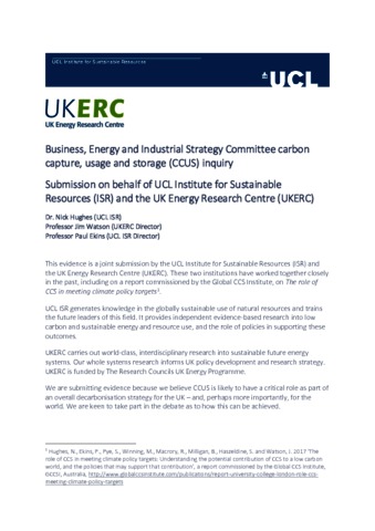 Title: | Business, Energy and Industrial Strategy Committee carbon capture, usage and storage (CCUS) inquiry. Submission on behalf of UCL Institute for Sustainable Resources (ISR) and the UK Energy Research Centre (UKERC) |