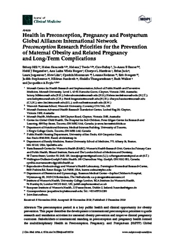 Title: | Health in Preconception, Pregnancy and Postpartum Global Alliance: International Network Preconception Research Priorities for the Prevention of Maternal Obesity and Related Pregnancy and Long-Term Complications |
