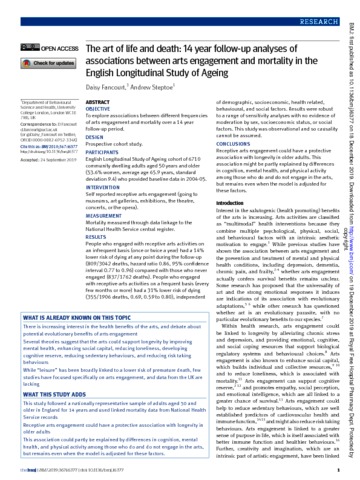 The art of life and death: 14 year follow-up analyses of associations between arts engagement and mortality in the English Longitudinal Study of Ageing.