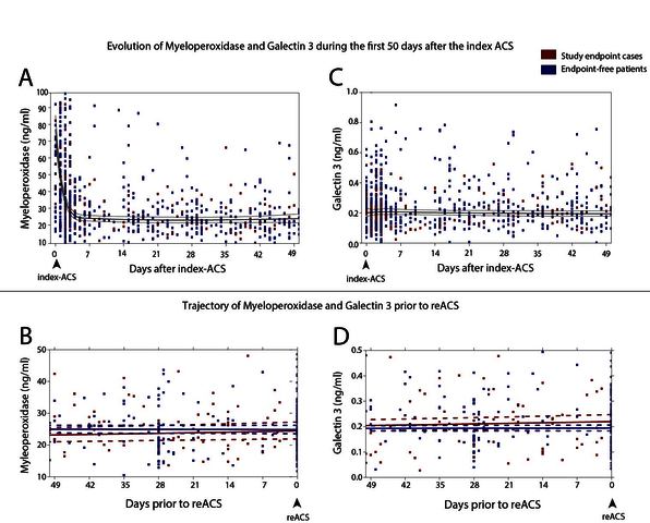 Temporal evolution of myeloperoxidase and galectin 3 during 1 year after acute coronary syndrome admission.