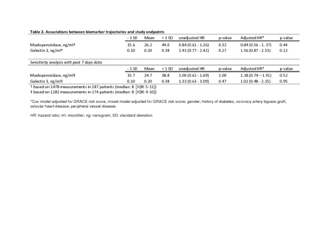 Title: | Temporal evolution of myeloperoxidase and galectin 3 during 1 year after acute coronary syndrome admission |