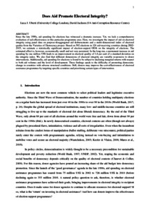 Since the late 1990s, aid spending for elections has witnessed a dramatic increase. Yet, we lack a comprehensive evaluation of aid effectiveness in this particular programme area. Here, we investigate the impact of aid on electoral integrity using panel data on purpose-disaggregated aid disbursements and a multi-dimensional index of electoral quality from the Varieties of Democracy project. Based on 502 elections in 126 aid-receiving countries during 2002–2015, we estimate a statistically significant effect of election-support ODA on the integrity of elections. The estimated effect is, however, economically small and not very persistent. In the long run, a permanent increase in aid spending by one million US$ leads to an improvement in electoral quality of 1.4 per cent of a standard deviation on the integrity index. We also find that different dimensions of electoral integrity are variably responsive to donor interventions. Additionally, aid spending for elections is subject to diminishing marginal returns, and is less effective at higher levels of development. These findings underline the difficulty of promoting democratic change in countries with adverse structural conditions. Still, donors may improve the cost-effectiveness of electoral assistance programmes by targeting specific countries and prioritising certain types of intervention.