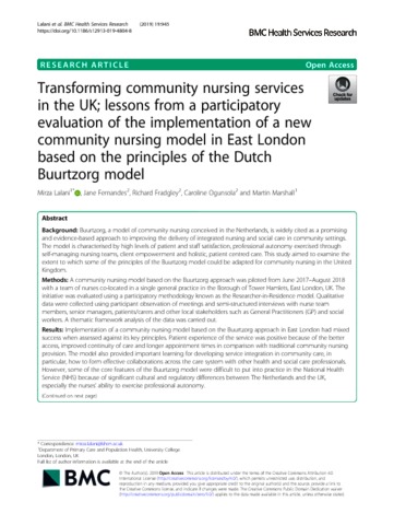 Title: | Transforming community nursing services in the UK; lessons from a participatory evaluation of the implementation of a new community nursing model in East London based on the principles of the Dutch Buurtzorg model |