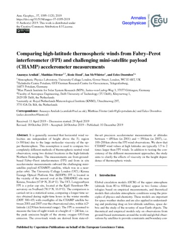 Title: | Comparing high-latitude thermospheric winds from Fabry-Perot interferometer (FPI) and challenging mini-satellite payload (CHAMP) accelerometer measurements |