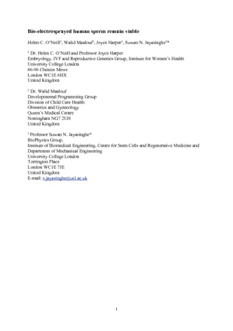 In our previous investigations, we demonstrated that certain living cells exposed to bio-electrosprays remained viable, and behaved as expected in comparison to control cells. These studies also extended to post-bio-electrosprayed cells being transplanted into mice, which demonstrated no rejection, and in fact they were seen to integrate with the surrounding host tissues. Therefore, highlighting bio-electrosprays as a front running bioplatform for engineering functional tissues for repair, replacement and rejuvenation of damaged and/ageing tissues. In the present studies, we take bio-electrosprays further into human health, investigating the possibility of this platform biotechnology to directly handle the smallest and most highly specialized cell in the human body, the spermatozoon. These studies demonstrated the ability for bio-electrosprays to directly handle human sperm without compromising their viability, while also demonstrating the technology’s capacity to encapsulate human sperm. These investigations reported herein present interesting implications to human reproductive science and medicine, while also having promising applicability to areas such as the agriculture and aquaculture industries.