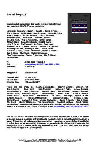 Title: | Improving Study Conduct and Data Quality in Clinical Trials of Chronic Pain Treatments: IMMPACT Recommendations |