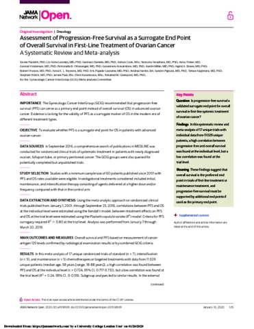 | Title: | Assessment of Progression-Free Survival as a Surrogate End Point of Overall Survival in First-Line Treatment of Ovarian Cancer: A Systematic Review and Meta-analysis. |