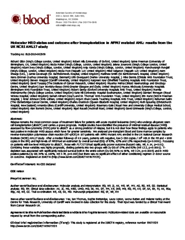 | Title: | Molecular MRD status and outcome after transplantation in NPM1 mutated AML: results from the UK NCRI AML17 study |
