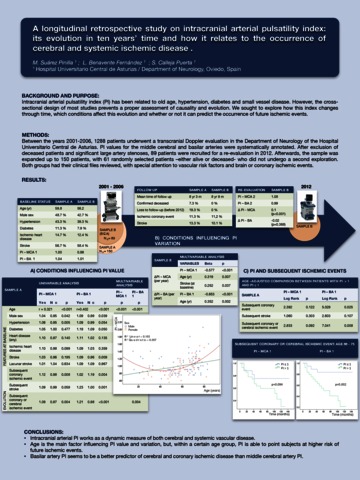 BACKGROUND AND AIMS: Intracranial arterial pulsatility index (PI) has been related to old age, hypertension, diabetes and small vessel disease. However, the cross- sectional design of most studies prevents a proper assessment of causality and evolution. We sought to explore how this index changes through time, which conditions affect this evolution and whether or not it can predict the occurrence of future ischemic events. METHODS: Between the years 2001-2006, 1288 patients underwent a transcranial Doppler evaluation in the Department of Neurology of the Hospital Universitario Central de Asturias. PI values for the middle cerebral and basilar arteries were systematically annotated. After exclusion of deceased patients and significant large artery stenoses, 89 patients were recruited for a re-evaluation in 2012. Afterwards, the sample was expanded up to 150 patients, with 61 randomly selected patients –either alive or deceased- who did not undergo a second exploration. Both groups had their clinical files reviewed, with special attention to vascular risk factors and brain or coronary ischemic events. RESULTS AND DISCUSSION: Our results pointed to the following conclusions: • Intracranial arterial PI works as a dynamic measure of both cerebral and systemic vascular disease. • Age is the main factor influencing PI value and variation, but, within a certain age group, PI is able to point subjects at higher long-term risk of future ischemic events. • Basilar artery PI seems to be a better predictor of future cerebral and coronary ischemic disease than middle cerebral artery PI.