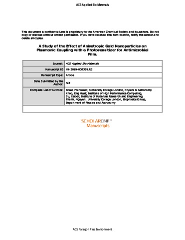 Title: | Study of the Effect of Anisotropic Gold Nanoparticles on Plasmonic Coupling with a Photosensitizer for Antimicrobial Film |