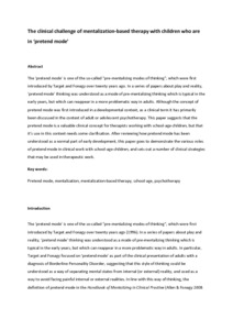The “pretend mode” is one of the so-called “pre-mentalizing modes of thinking”, which were first introduced by Target and Fonagy over 20 years ago. In a series of papers about play and reality, “pretend mode” thinking was understood as a mode of pre-mentalizing thinking which is typical in the early years, but which can reappear in a more problematic way in adults. Although the concept of pretend mode was first introduced in a developmental context, as a clinical term it has primarily been discussed in the context of adult or adolescent psychotherapy. This paper suggests that the pretend mode is a valuable clinical concept for therapists working with school-age children, but that its use in this context needs some clarification. After reviewing how pretend mode has been understood as a normal part of early development, this paper goes to demonstrate the various roles of pretend mode in clinical work with school-age children and sets out a number of clinical strategies that may be used in therapeutic work.