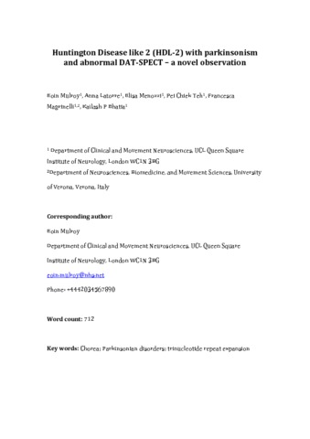 Bhatia_Huntington Disease like 2 (HDL-2) with parkinsonism and abnormal DAT-SPECT – a novel observation.pdf - Accepted Version Download (403kB) | Preview |