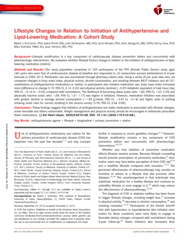 Background: Lifestyle modification is a key component of cardiovascular disease prevention before and concurrently with pharmacologic interventions. We evaluated whether lifestyle factors change in relation to the initiation of antihypertensive or lipid‐lowering medication (statins). / Methods and Results: The study population comprised 41 225 participants of the FPS (Finnish Public Sector) study aged ≥40 years who were free of cardiovascular disease at baseline and responded to ≥2 consecutive surveys administered in 4‐year intervals in 2000–2013. Medication use was ascertained through pharmacy‐claims data. Using a series of pre–post data sets, we compared changes in body mass index, physical activity, alcohol consumption, and smoking between 8837 initiators and 46 021 noninitiators of antihypertensive medications or statins. In participants who initiated medication use, body mass index increased more (difference in change 0.19; 95% CI, 0.16–0.22) and physical activity declined (−0.09 metabolic equivalent of task hour/day; 95% CI, −0.16 to −0.02) compared with noninitiators. The likelihood of becoming obese (odds ratio: 1.82; 95% CI, 1.63–2.03) and physically inactive (odds ratio: 1.08; 95% CI, 1.01–1.17) was higher in initiators. However, medication initiation was associated with greater decline in average alcohol consumption (−1.85 g/week; 95% CI, −3.67 to −0.14) and higher odds of quitting smoking (odds ratio for current smoking in the second survey: 0.74; 95% CI, 0.64–0.85). / Conclusions: These findings suggest that initiation of antihypertensive and statin medication is associated with lifestyle changes, some favorable and others unfavorable. Weight management and physical activity should be encouraged in individuals prescribed these medications.
