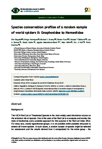 Background: The IUCN Red List of Threatened Species is the most widely used information source on the extinction risk of species. One of the uses of the Red List is to evaluate and monitor the state of biodiversity and a possible approach for this purpose is the Red List Index (RLI). For many taxa, mainly hyperdiverse groups, it is not possible within available resources to assess all known species. In such cases, a random sample of species might be selected for assessment and the results derived from it extrapolated for the entire group - the Sampled Red List Index (SRLI). The current contribution is the second in four papers that will constitute the baseline of a future spider SRLI encompassing 200 species distributed across the world. / New information: A sample of 200 species of spiders were randomly selected from the World Spider Catalogue, an updated global database containing all recognised species names for the group. The 200 selected species where divided taxonomically at the family level and the familes were ordered alphabetically. In this publication, we present the conservation profiles of 45 species belonging to the families alphabetically arranged between Gnaphosidae and Nemesiidae, which encompassed Gnaphosidae, Idiopidae, Linyphiidae, Liocranidae, Lycosidae, Micropholcommatidae, Mysmenidae and Nemesiidae.