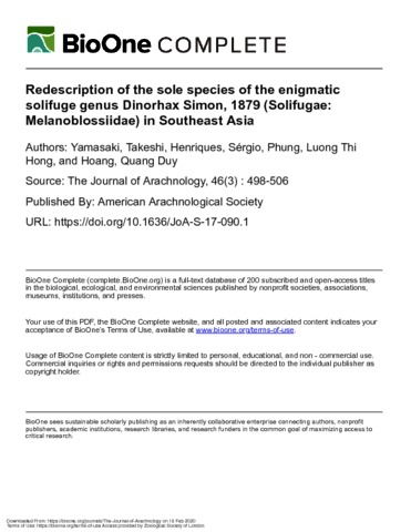 Title: | Redescription of the sole species of the enigmatic solifuge genus Dinorhax Simon, 1879 (Solifugae: Melanoblossiidae) in Southeast Asia |
