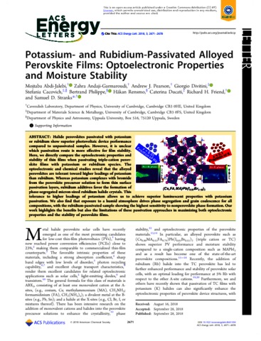 Potassium- and Rubidium-Passivated Alloyed Perovskite Films Optoelectronic Properties and Moisture Stability.pdf - Published Version Download (6MB) | Preview |