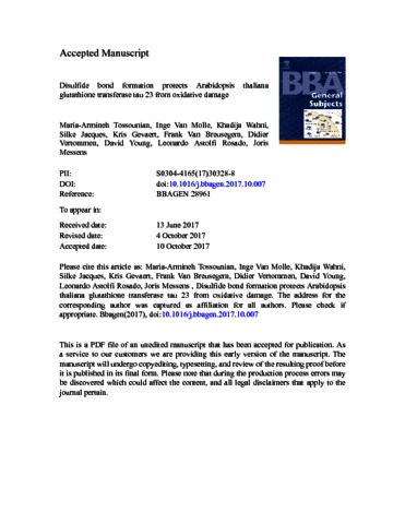 Title: | Disulfide bond formation protects Arabidopsis thaliana glutathione transferase tau 23 from oxidative damage |
