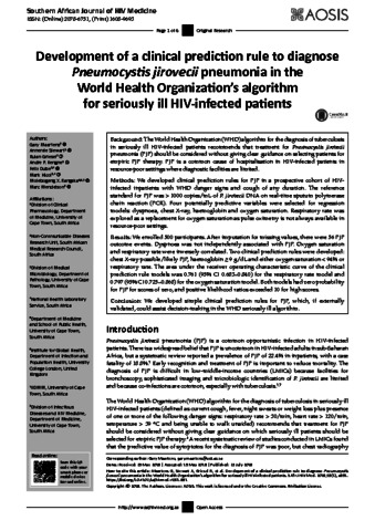 Title: | Development of a clinical prediction rule to diagnose Pneumocystis jirovecii pneumonia in the World Health Organization's algorithm for seriously ill HIV-infected patients |