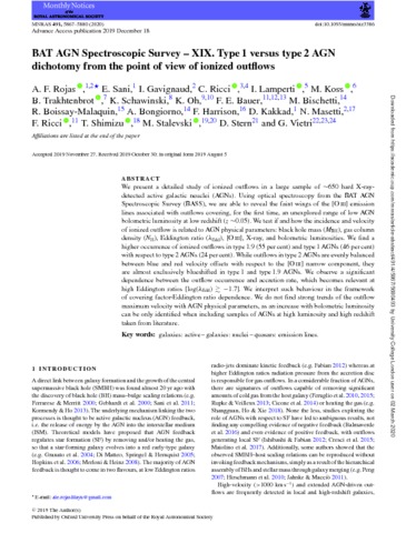 Title: | BAT AGN Spectroscopic Survey – XIX. Type 1 versus type 2 AGN dichotomy from the point of view of ionized outflows |