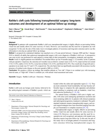 Rathke's cleft cysts following transsphenoidal surgery: long-term outcomes and development of an optimal follow-up strategy.