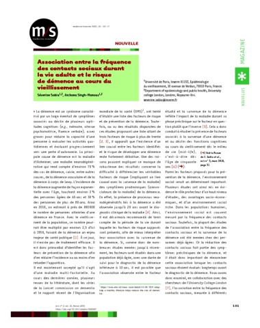 Title: | Association entre la fréquence des contacts sociaux durant la vie adulte et le risque de démence au cours du vieillissement = Association between social contacts in adulthood and dementia risk in old age |