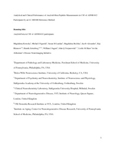 | Title: | Analytical and Clinical Performance of Amyloid-Beta Peptides Measurements in CSF of ADNIGO/2 Participants by an LC–MS/MS Reference Method |