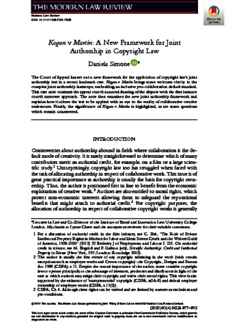 The Court of Appeal has set out a new framework for the application of copyright law’s joint authorship test in a recent landmark case. Kogan v Martin brings some welcome clarity to the complex joint authorship landscape, embedding an inclusive pro-collaboration default standard. This case note contrasts the appeal court’s nuanced framing of the dispute to the first instance court’s narrower approach. Then, it examines the new joint authorship framework explaining how it allows the test to be applied with an eye to the reality of collaborative creative endeavours. Finally, the significance of this decision is highlighted, as are some questions which remain unanswered.