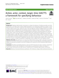 BACKGROUND: Designing implementation interventions to change the behaviour of healthcare providers and other professionals in the health system requires detailed specification of the behaviour(s) targeted for change to ensure alignment between intervention components and measured outcomes. Detailed behaviour specification can help to clarify evidence-practice gaps, clarify who needs to do what differently, identify modifiable barriers and enablers, design interventions to address these and ultimately provides an indicator of what to measure to evaluate an intervention’s effect on behaviour change. An existing behaviour specification framework proposes four domains (Target, Action, Context, Time; TACT), but insufficiently clarifies who is performing the behaviour (i.e. the Actor). Specifying the Actor is especially important in healthcare settings characterised by multiple behaviours performed by multiple different people. We propose and describe an extension and re-ordering of TACT to enhance its utility to implementation intervention designers, practitioners and trialists: the Action, Actor, Context, Target, Time (AACTT) framework. We aim to demonstrate its application across key steps of implementation research and to provide tools for its use in practice to clarify the behaviours of stakeholders across multiple levels of the healthcare system. METHODS AND RESULTS: We used French et al.’s four-step implementation process model to describe the potential applications of the AACTT framework for (a) clarifying who needs to do what differently, (b) identifying barriers and enablers, (c) selecting fit-for-purpose intervention strategies and components and (d) evaluating implementation interventions. CONCLUSIONS: Describing and detailing behaviour using the AACTT framework may help to enhance measurement of theoretical constructs, inform development of topic guides and questionnaires, enhance the design of implementation interventions and clarify outcome measurement for evaluating implementation interventions.