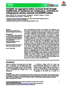 Title: | Insoluble tau aggregates induce neuronal death through modification of membrane ion conductance, activation of voltage‐gated calcium channels and NADPH oxidase |