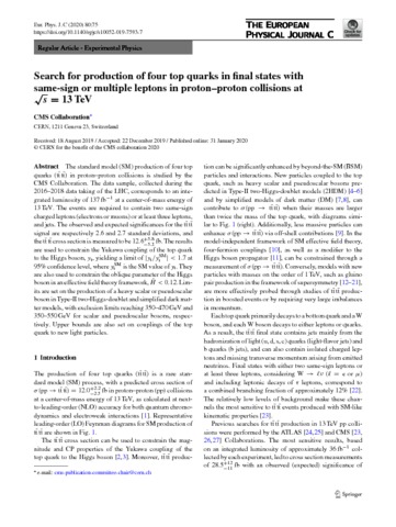 The standard model (SM) production of four top quarks (tt tt) in proton–proton collisions is studied by the CMS Collaboration. The data sample, collected during the 2016–2018 data taking of the LHC, corresponds to an integrated luminosity of 137 fb−1 at a center-of-mass energy of 13 TeV. The events are required to contain two same-sign charged leptons (electrons or muons) or at least three leptons, and jets. The observed and expected significances for the tt tt signal are respectively 2.6 and 2.7 standard deviations, and the tt tt cross section is measured to be 12.6+5.8 −5.2 fb. The results are used to constrain the Yukawa coupling of the top quark to the Higgs boson, yt, yielding a limit of |yt/ySM t | < 1.7 at 95% confidence level, where ySM t is the SM value of yt. They are also used to constrain the oblique parameter of the Higgs boson in an effective field theory framework, Hˆ < 0.12. Limits are set on the production of a heavy scalar or pseudoscalar boson in Type-II two-Higgs-doublet and simplified dark matter models, with exclusion limits reaching 350–470 GeV and 350–550 GeV for scalar and pseudoscalar bosons, respectively. Upper bounds are also set on couplings of the top quark to new light particles