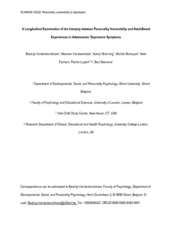 Objective: This study aimed to examine the interplay between the personality vulnerability dimensions of self‐criticism and dependency and experienced satisfaction or frustration of the basic psychological needs in relation to adolescents' depressive symptoms. In doing so, we investigated both indirect associations between personality and depressive symptoms (through need‐based experiences) and interactions between personality and need‐based experiences (i.e., moderation). / Method: A total of 149 adolescents (52% female, Mage = 15.20 years at initial assessment, SD = 3.09) participated in this three‐wave longitudinal study with 6‐month intervals. At each wave, adolescents reported on their personality, need‐based experiences, and depressive symptoms. / Results: Multilevel analyses showed that dependency and self‐criticism related to experiences of need frustration and depressive symptoms at both the between‐person level (i.e., the level of interindividual differences) and the within‐person level (i.e., the level of intraindividual change). In turn, need frustration was related to adolescents' depressive symptoms at both levels of analysis. Personality did not significantly moderate the associations between the psychological needs and depressive symptoms. / Conclusion: The results suggest that self‐criticism and dependency are related to experiences of psychological need frustration and depressive symptoms at the level of both interindividual differences and within person‐change.