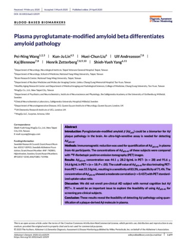 Title: | Plasma pyroglutamate-modified amyloid beta differentiates amyloid pathology |