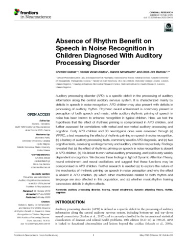 | Title: | Absence of Rhythm Benefit on Speech in Noise Recognition in Children Diagnosed With Auditory Processing Disorder |