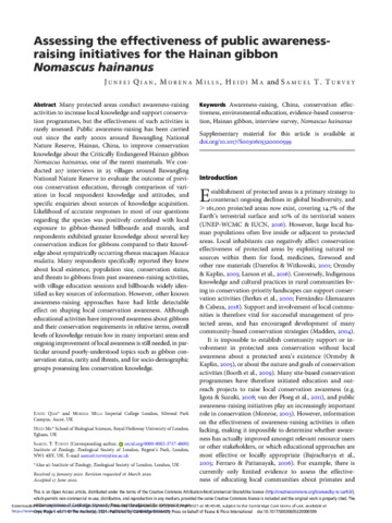 Title: | Assessing the effectiveness of public awareness-raising initiatives for the Hainan gibbon Nomascus hainanus |