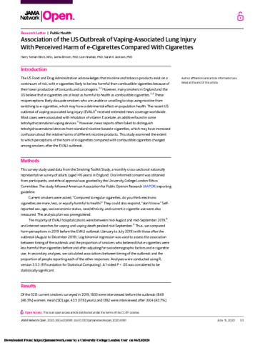 Title: | Association of the US Outbreak of Vaping-Associated Lung Injury With Perceived Harm of e-Cigarettes Compared With Cigarettes |