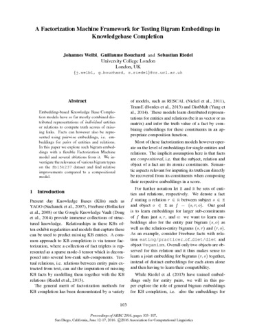 Title: | A Factorization Machine Framework for Testing Bigram Embeddings in Knowledgebase Completion |