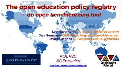 The OER World Map platform facilitates access to materials and knowledge to promote OEP, acting as a source of information for everyone interested in Open Education. One of its newest developments is the OE Policy Registry, which aims not only to record the current policies in open education but to become the knowledge hub to support the wider OE community in developing OE policies, helping them to locate and bench-learn from existing policies and the people and organisations which have developed and promoted them. Much discussion of the need for open education policy has occurred at the supranational level. In some cases, nations and subnational governments have taken up the challenge of incorporating policy to enable open resources and practices into education policymaking agendas. What is less clear, and less straightforward to investigate, is the extent to which individual institutions are developing policies to support openness. This session reports on the current state of OE policies internationally, based on the OE Policy Registry dataset. Through engagement with the data held in the Policy Registry it has been possible to collect and examine a wide range of policy documents and sketch some key features of the OE policy landscape. Further auditing of this dataset is needed, in order that the registry can be used effectively to support policy benchlearning by OE advocates, researchers and policymakers. The session will cover the initial findings of a research project conducted using this dataset, and additionally, inputs gained during a series of workshops designed to support OE policy co-creation. We will present key features of the OE Policy Registry to support – OE advocates seeking to support and enhance practice through policy – Policymakers at institutional and governmental levels – Researchers interested in OE policy For these user groups, several different use-cases are addressed and presented: – Policymakers can showcase and find good practice policy exemplars, which they can adapt and reuse within their context. – OER advocates and advocacy networks can connect with each other, so that they can exchange experiences and cooperate in joint projects. – Researchers can collect data on policy activities in different educational sectors and geographical areas, gaining a deeper understanding of the functioning of OE ecosystems and develop strategies for mainstreaming. Recording available: https://youtu.be/ra34cClfd9w