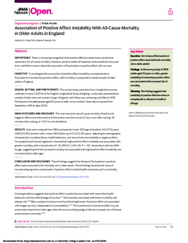 Importance: There is increasing recognition that positive affective states have a protective association for all-cause mortality. However, positive states of happiness and excitement vary over time, and little is known about the association of fluctuations in positive affect with survival. / Objective: To investigate the association of positive affect instability, conceptualized as fluctuations in momentary positive affect, with mortality in a population-based sample of older adults in England. / Design, Setting, and Participants: This survey study used data from a longitudinal survey collected in wave 2 (2004) of the English Longitudinal Study of Ageing, a nationally representative sample of older men and women living in England, with follow-up continuing until March 2018. Participants included people aged 50 years or older at recruitment. Data were analyzed from September 2019 to April 2020. / Main Outcomes and Measures: The main outcome was all-cause mortality. Positive and negative affect were measured at 4 time points over the course of 1 day: soon after waking, 30 minutes after waking, at 7:00 pm, and at bedtime. / Results: Data were analyzed from 3834 participants (mean [SD] age at baseline, 64.0 [7.4] years; 2082 [54.3%] women) with a mean (SD) follow-up of 12.25 (2.60) years. Adjusting for demographic characteristics, baseline illness, health behaviors, and mean level and instability in negative affect, Cox proportional hazards regression showed that high positive affect instability was associated with greater mortality, with a hazard ratio of 1.25 (95% CI, 1.04-1.49; P = .02). Associations did not differ by age, suggesting that the increased mortality risk associated with high positive affect instability was not restricted to older ages. / Conclusion and Relevance: These findings suggest that temporal fluctuations in positive affect were associated with mortality risk in older adults. These findings illustrate the value of incorporating dynamic assessments of positive affect in distal health outcomes such as mortality.