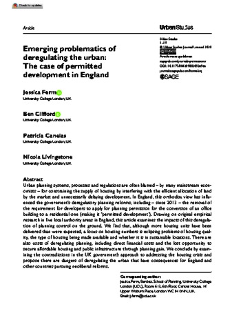 | Title: | Emerging problematics of deregulating the urban: The case of permitted development in England |
