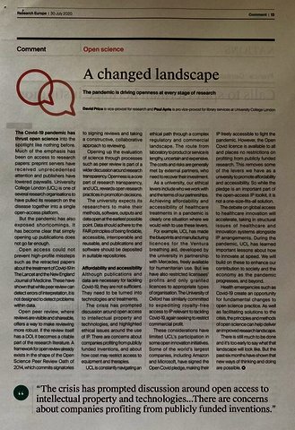 This op-ed price suggests that, emerging from the covid-19 pandemic, Open Science is the way forward and shows how this approach can work in harmony with commercial activity which a university might wish to undertake.