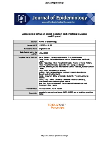 Keywords: | ELSA, JAGES, repeated cross-sectional study, smoking status, social isolation |