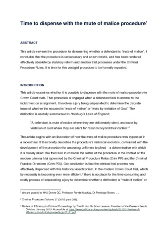 Assesses whether measures for establishing whether a defendant is "mute of malice" are anachronistic and obsolete, and should be repealed. Reviews the historical role of the mute of malice procedure, its significance, how it differs from unfitness to plead and how developments such as practice directions and procedural rule changes have rendered it unnecessary. Suggests how reforms involving repeal might be implemented.