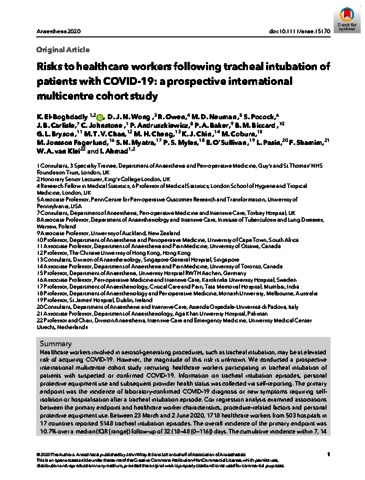 Title: | Risks to healthcare workers following tracheal intubation of patients with COVID-19: a prospective international multicentre cohort study |
